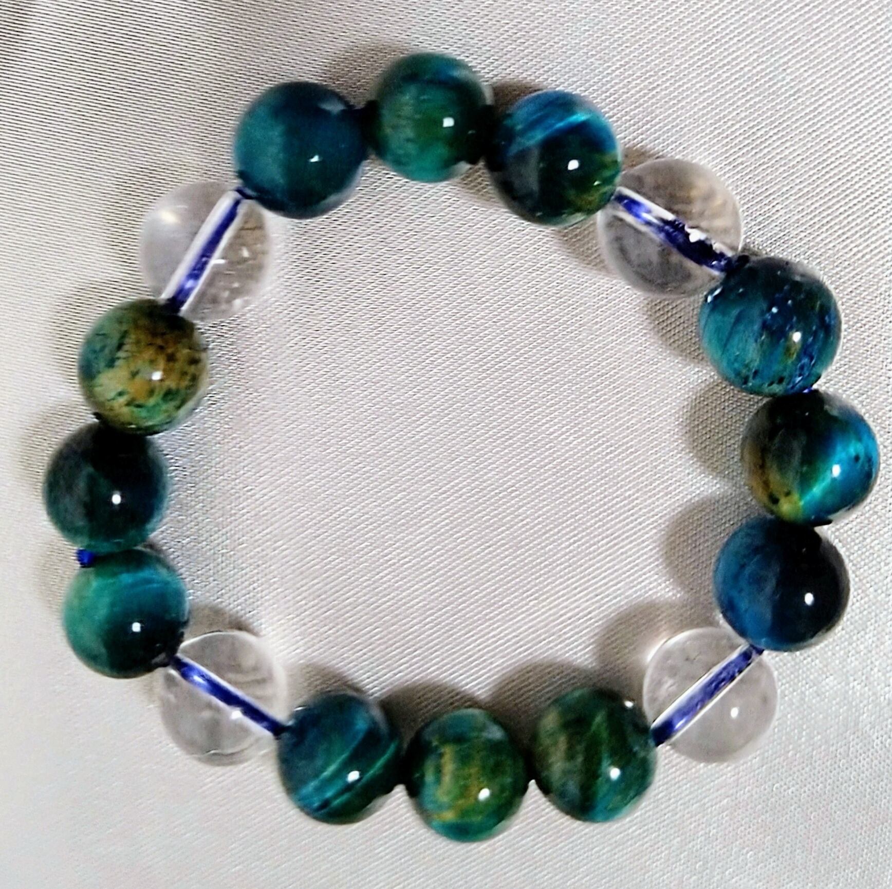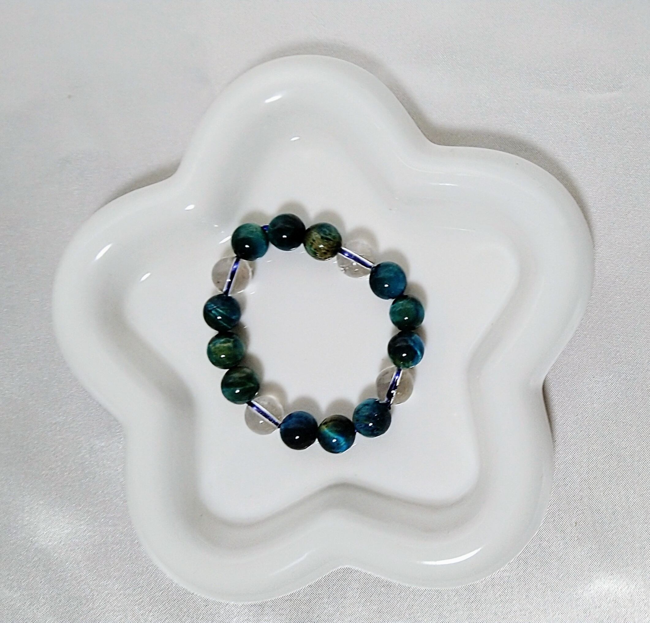 ブルータイガーアイと水晶のコンビです。10ミリ玉、内径は4.5センチと少々小さめです。水晶は4方に配置、オペロン糸はブルーです。タイガーアイは変化するそうで、最初の状態がこのブルーで、鉱物中の鉄分などが酸化することによって黄色く変化していくそうです。色によって意味合いも変わり、ブルーは感の鋭さや冷静さを引き出すと言われているそうです。洞察力や直感を高めると言われ、多くの方に愛されている石です。水晶は、エネルギーの増幅や浄化の力があり、身につけることで心を落ち着かせ、また運気をサポートします。これらの組み合わせが、あなたの個性を引き立て、日常をより豊かにしてくれることでしょう。