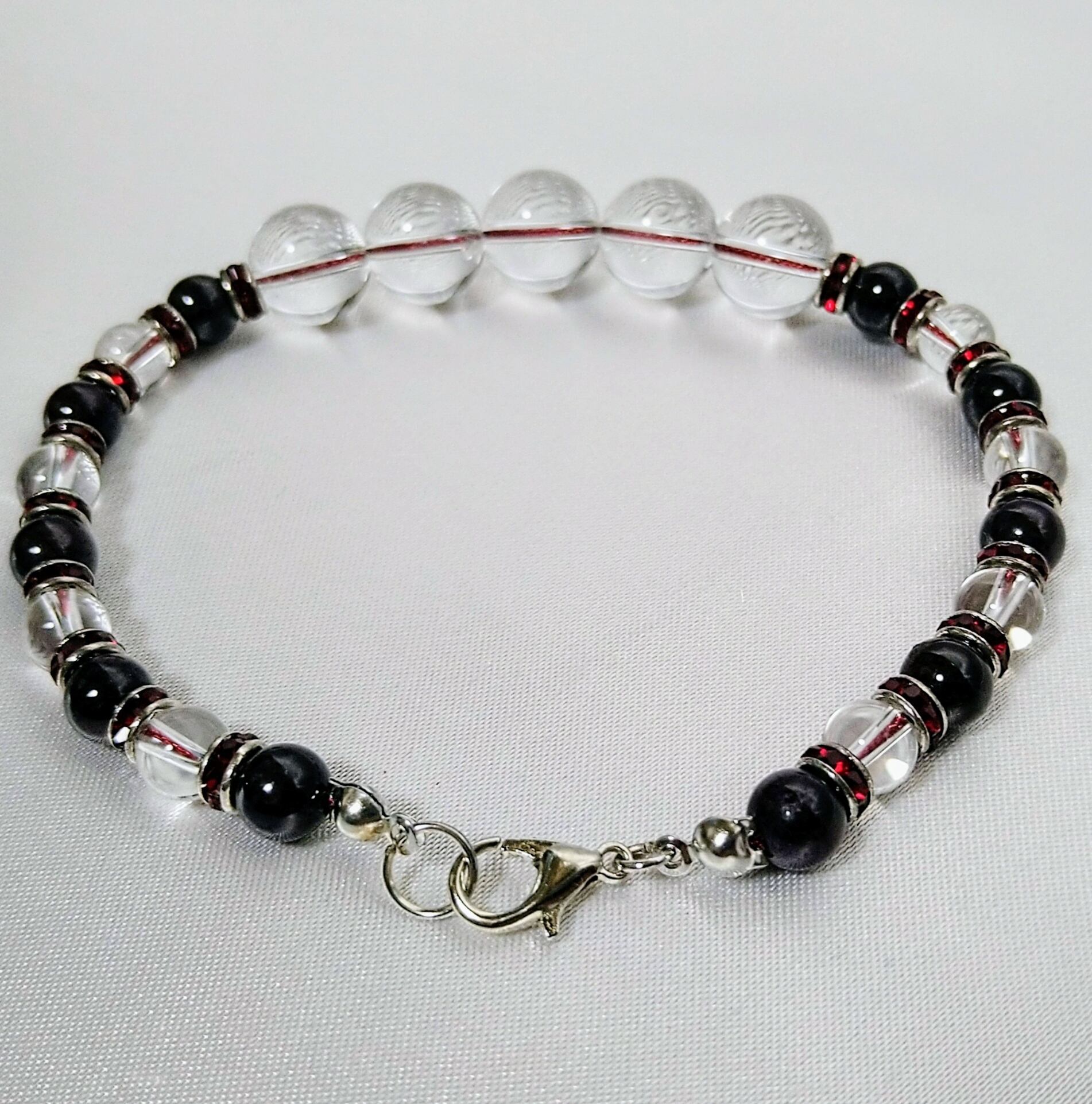 水晶5連は10ミリ玉、カニカン、丸カンへとガーネット、水晶6ミリ玉が交互に並び繋がります。6ミリ玉の間には国内物のロンデルが赤い光で彩ります。全長は22センチ、内径約7センチです。えんじ色の中華糸使用。オペロン糸の方が取り扱いは楽ですが… ガーネット…日本名はザクロ石。生き生きと積極的に力を与えると言われ、本気力を高める時にサポートしてくれると言われるそうです。なんと心強い…水晶は浄化とバランスをもたらすと言われています。おしゃれなアクセントとして、普段使いや特別な日にもぴったりです。