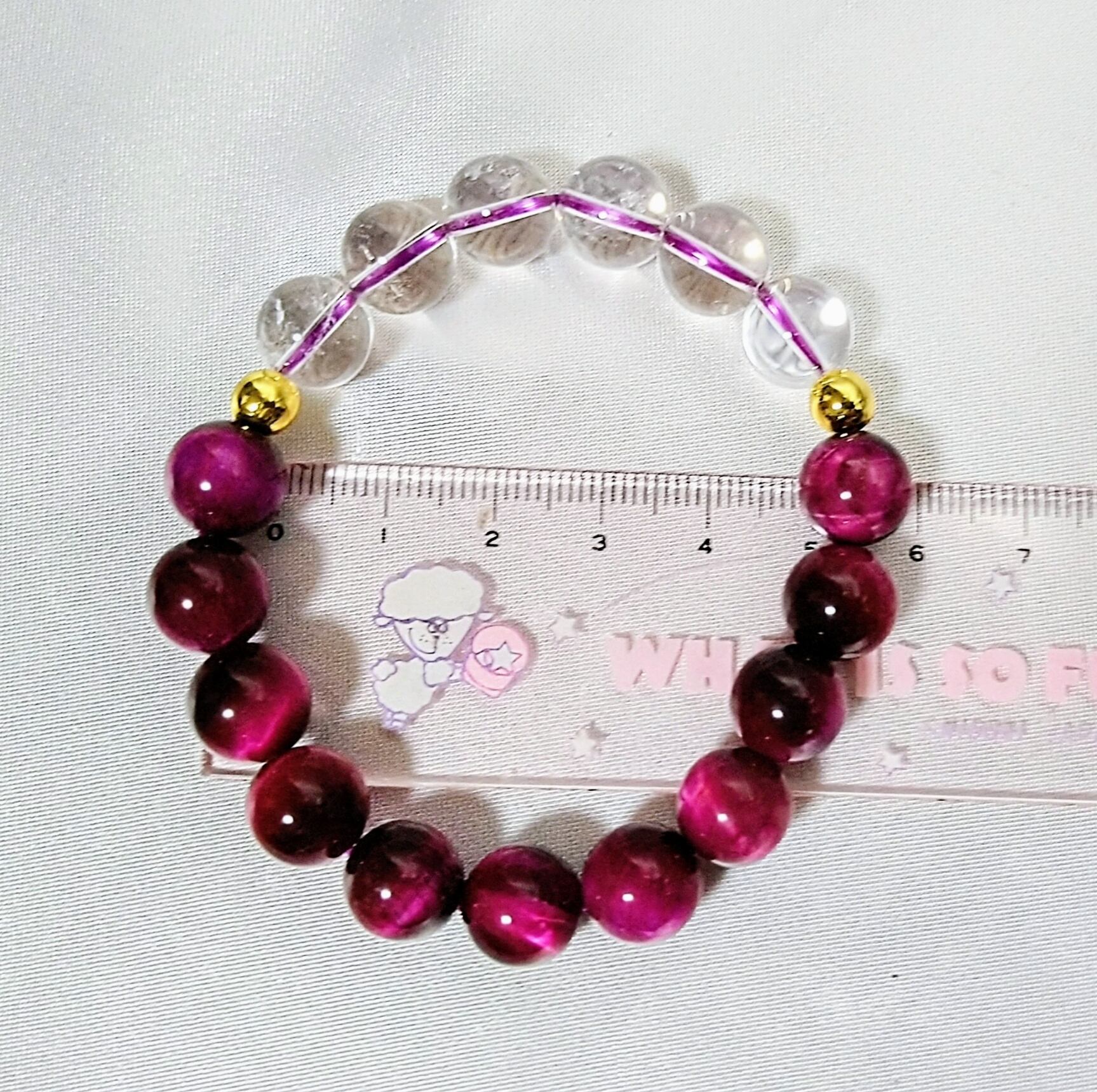 内径5.5センチ、オペロン糸使用で、少し伸びて心地よくフィットします。ピンクタイガーアイは、心の安定やポジティブなエネルギーをもたらすといわれています。水晶との組み合わせにより、さらなるエネルギーの浄化や集中力アップが期待できます。