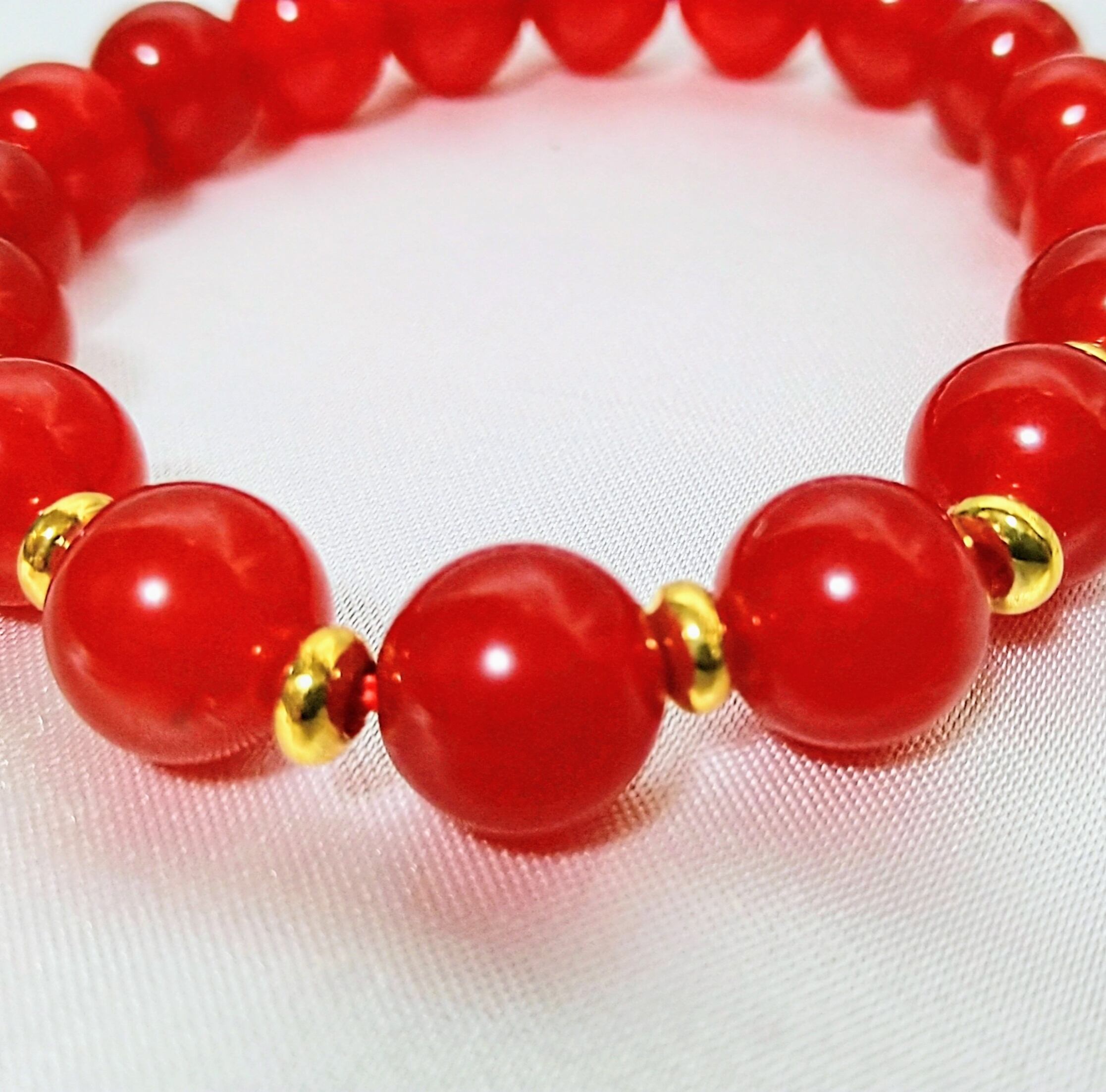 こちらも10ミリ玉使用、アクセントにはゴールドのスペーサービーズを入れてみました。こちらも内径5.5センチでオペロン糸使用で少々伸びます。美しいレッドのカーネリアンアゲードが、力強いエネルギーを感じさせるデザインです。
